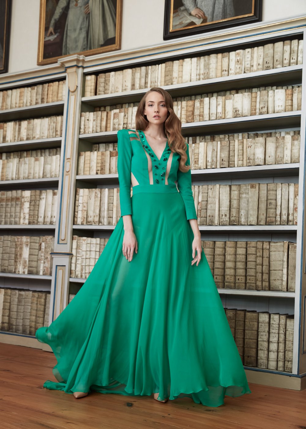 Iconic dress made in a vibrant green color, with a V-neckline and sophisticated transparencies, subtly baring parts of the skin. It is adorned with exquisite rhinestones that determine the exclusive selection of a unique and extraordinary piece.