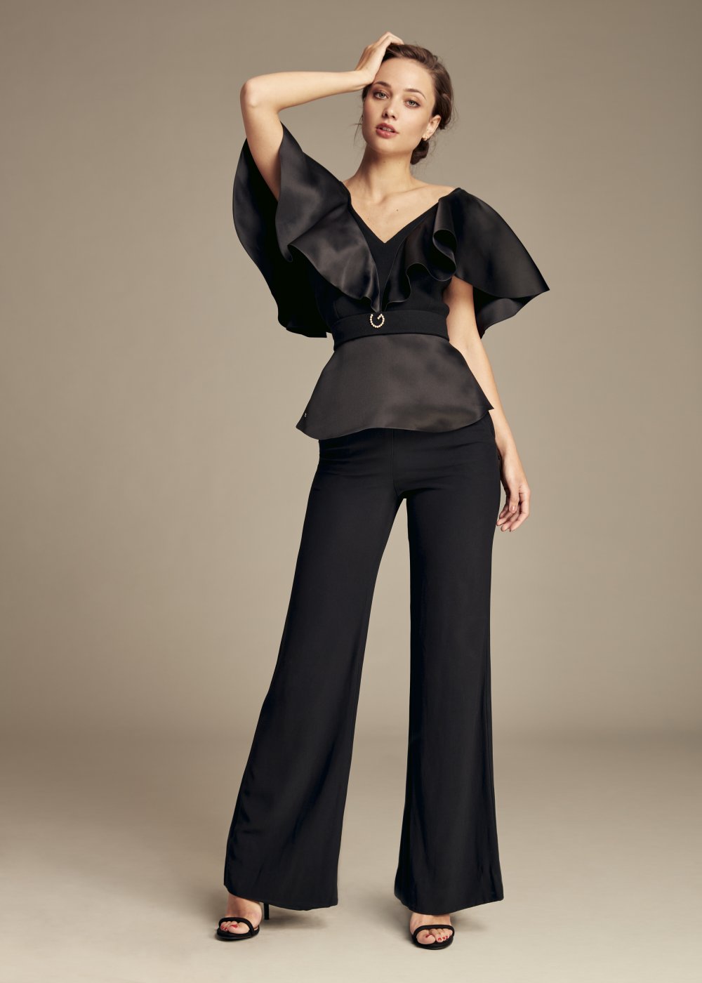 “Sophisticated volume and feminine essence”, maxi ruffles and straight pants with movement accompanied by a matching belt to mark the waist. A total black glamour look.